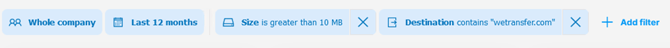 An administrator wants to see all files larger than 10 MB that were uploaded to wetransfer.com. They can set up the following filters: