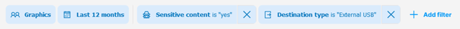 An administrator is investigating a potential data leak in the Graphics department. They want to see all sensitive files that were transferred to external USBs: