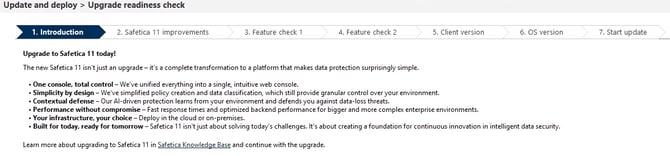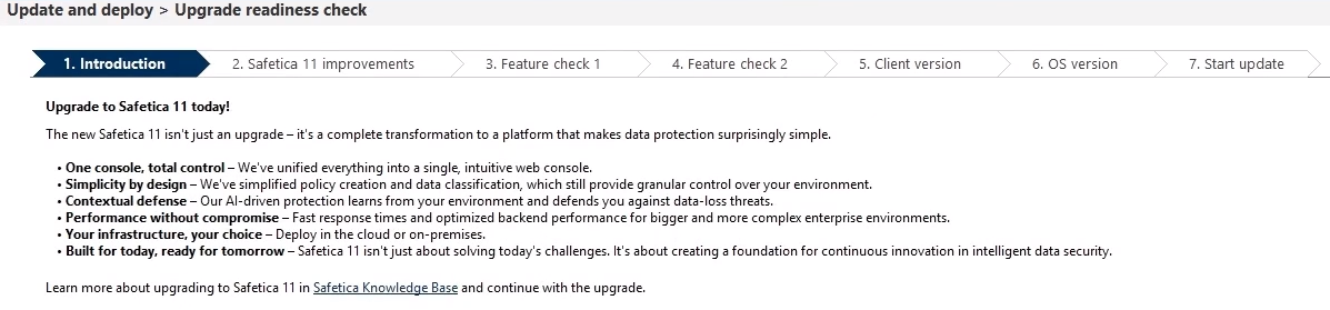 The Upgrade readiness check will guide you through the upgrade and inform you about any requirements you don’t meet. Some checks cannot be by-passed (e.g. the version of Safetica Management Service or the version of SQL server), others can (e.g. Safetica Client versions and other checks).