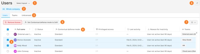 5. Management actions: After selecting one or more users, you can choose a management action (Remove license and Set Contextual defense mode in the Users tab; Assign license in the Unlicensed tab).