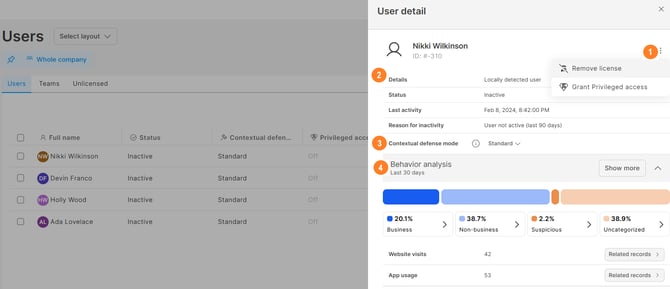 Get an overview of your users, divide them into teams, assign and remove their Safetica licenses, grant or revoke Privileged access for them, or set their Contextual defense mode.